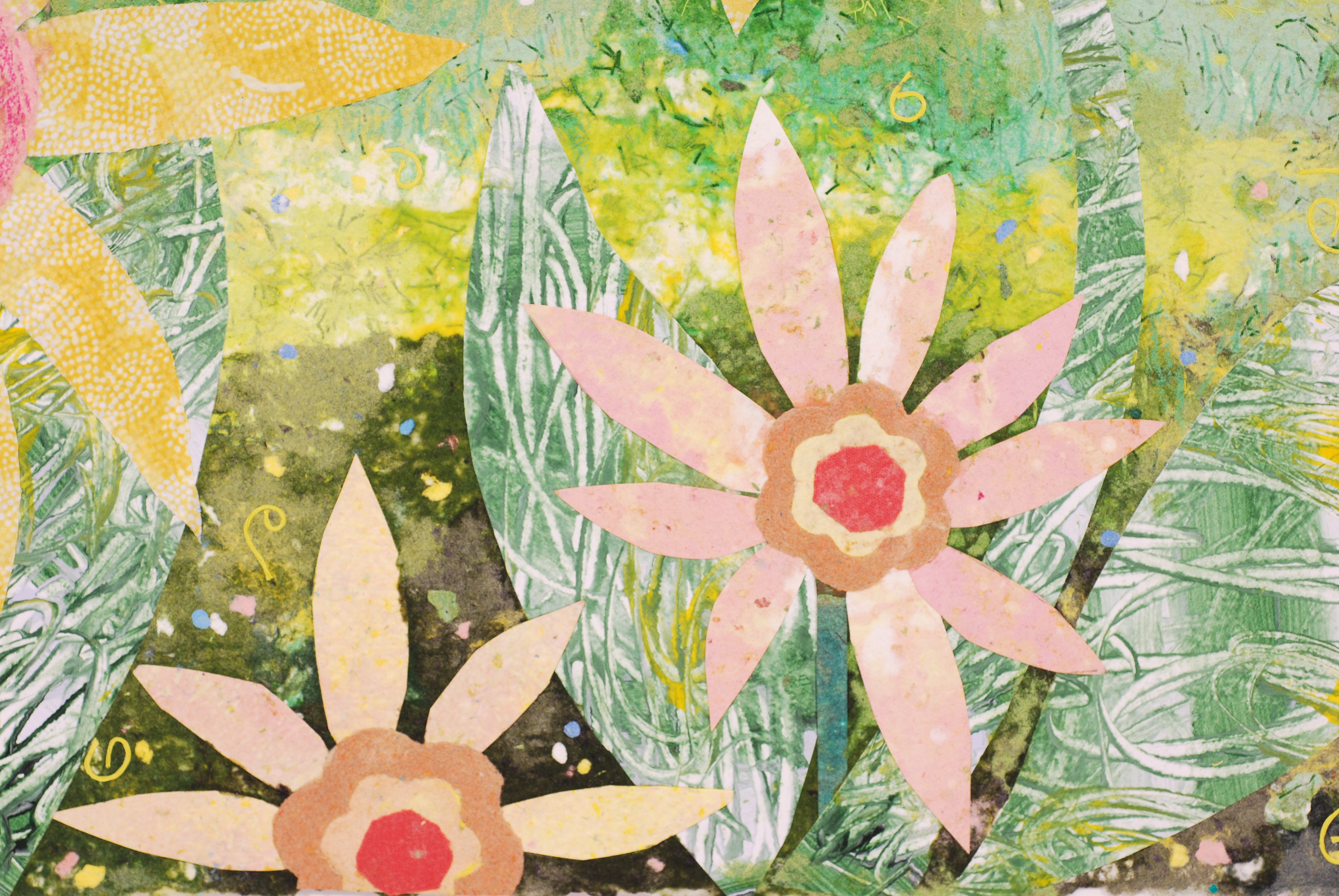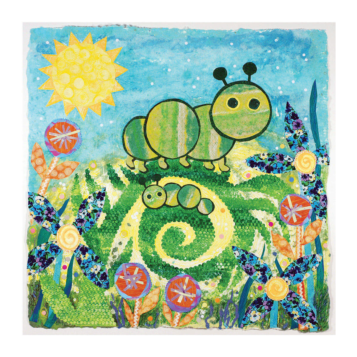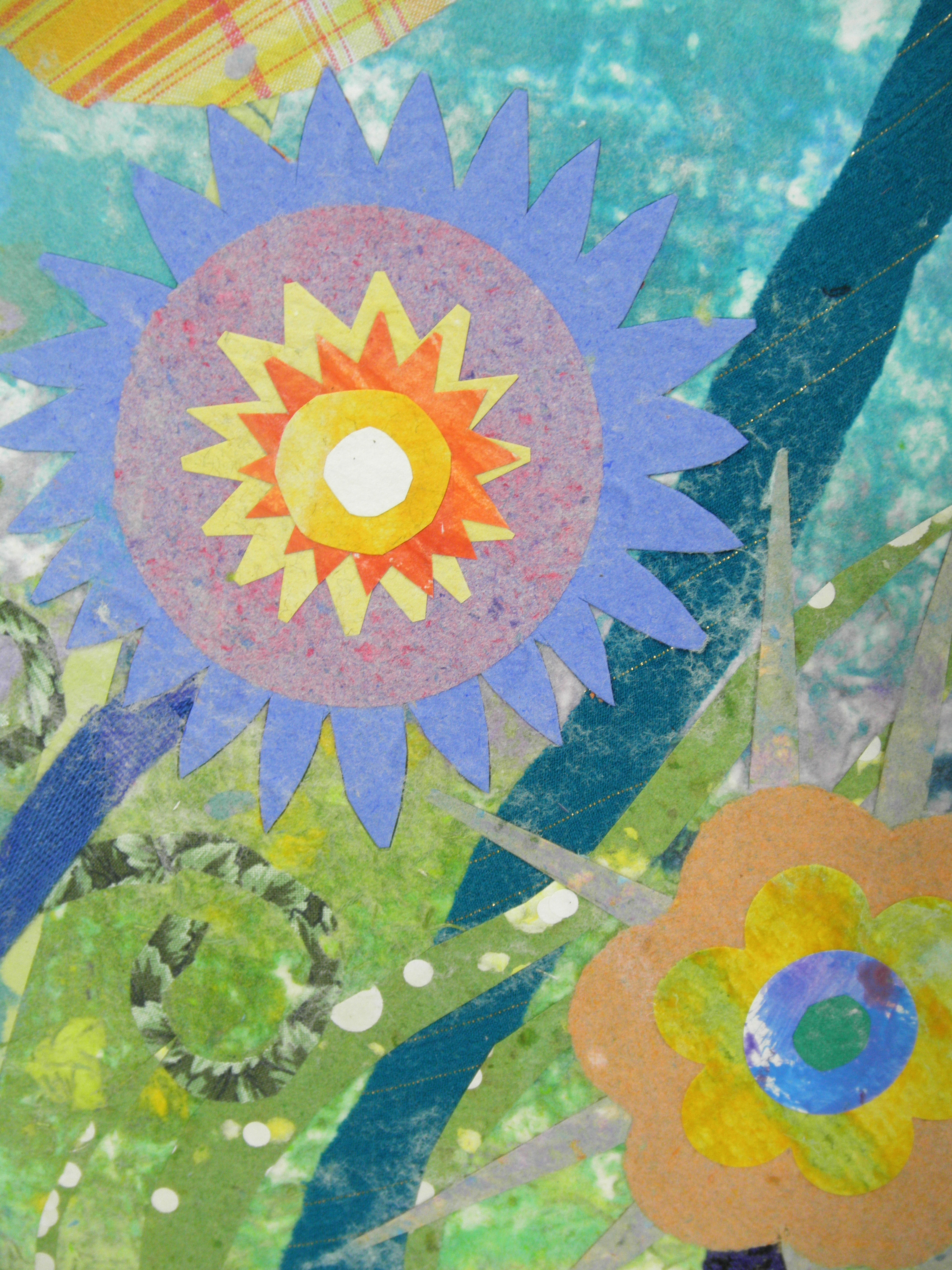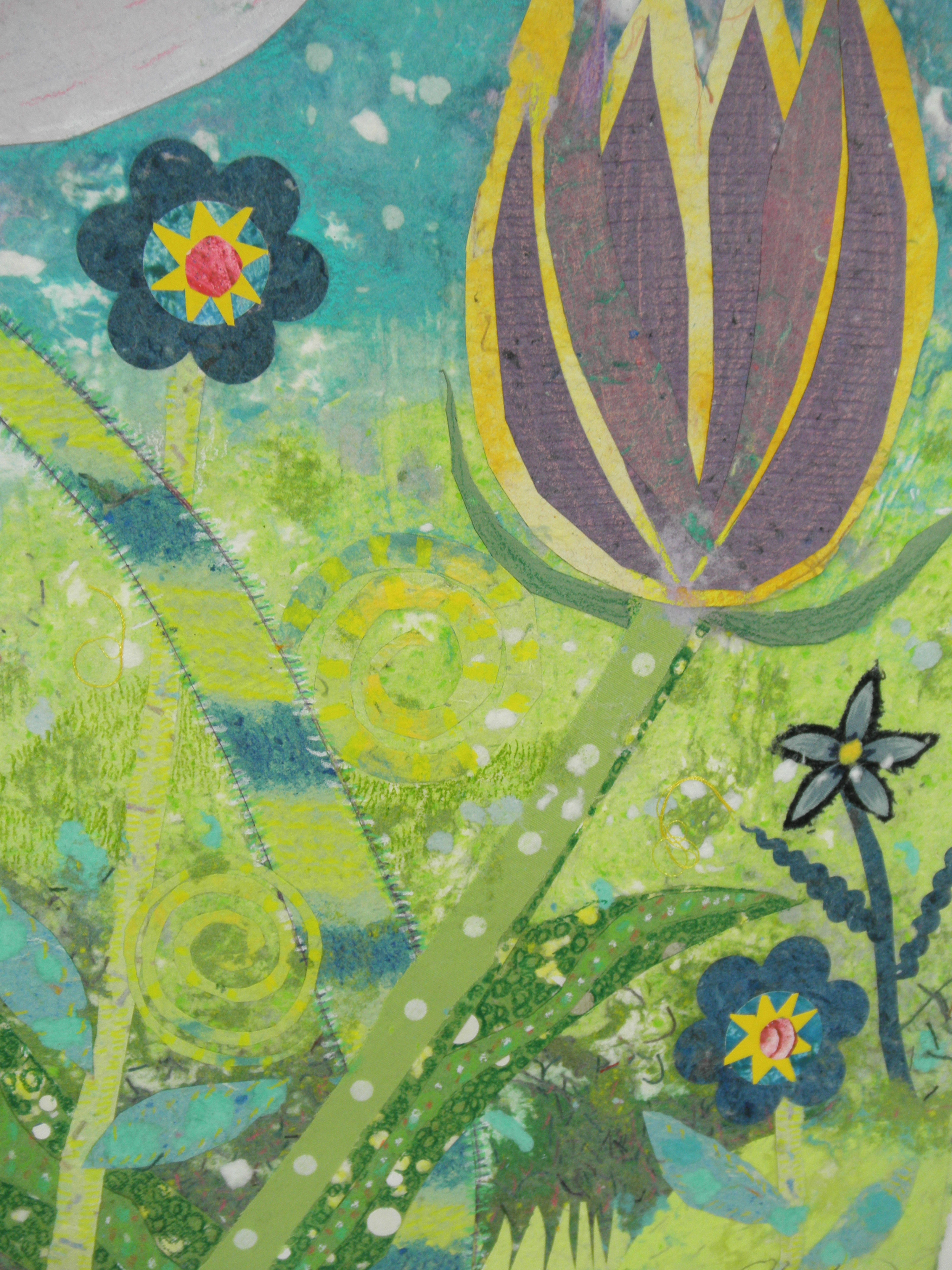 I feel honored to be a part of this program and to have the opportunity to create these colorful, whimsical gardens of hope and healing for the hospital setting. Many months were spent working with the committee at Children’s to come up with the final art. From initial concepts to scale drawings, (10 pieces are 20” x 28” and 1 piece is 24” x 24”) finding fabrics, making various handmade textured papers in the Children’s Hospital color palette , cutting out all the shapes and then creating a pulp painted base took a number of months. After the assembly of the elements in the wet stage, pressing and drying of the paper, I finally was able to look at the art hanging on a wall and did the finishing colored pencil drawing to enhance the details.
