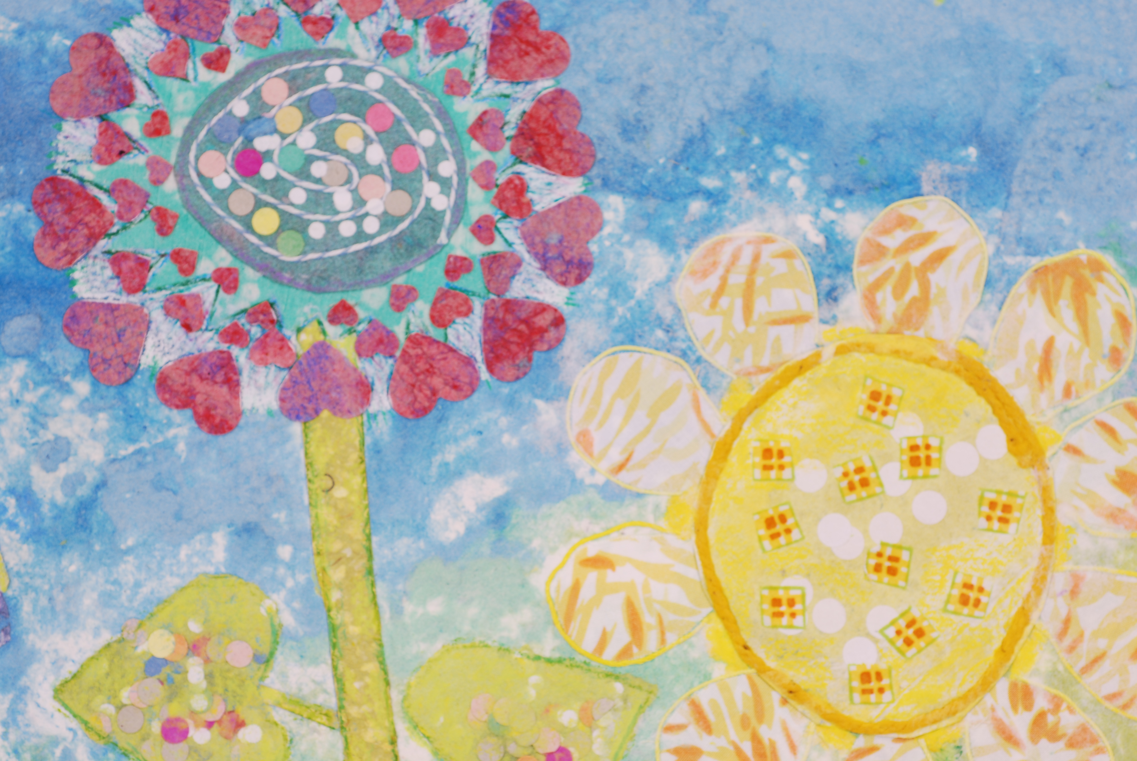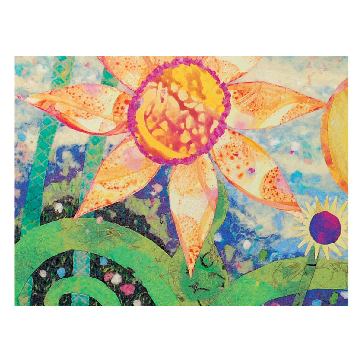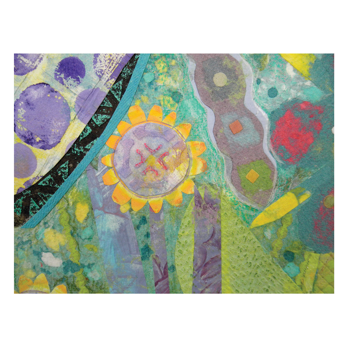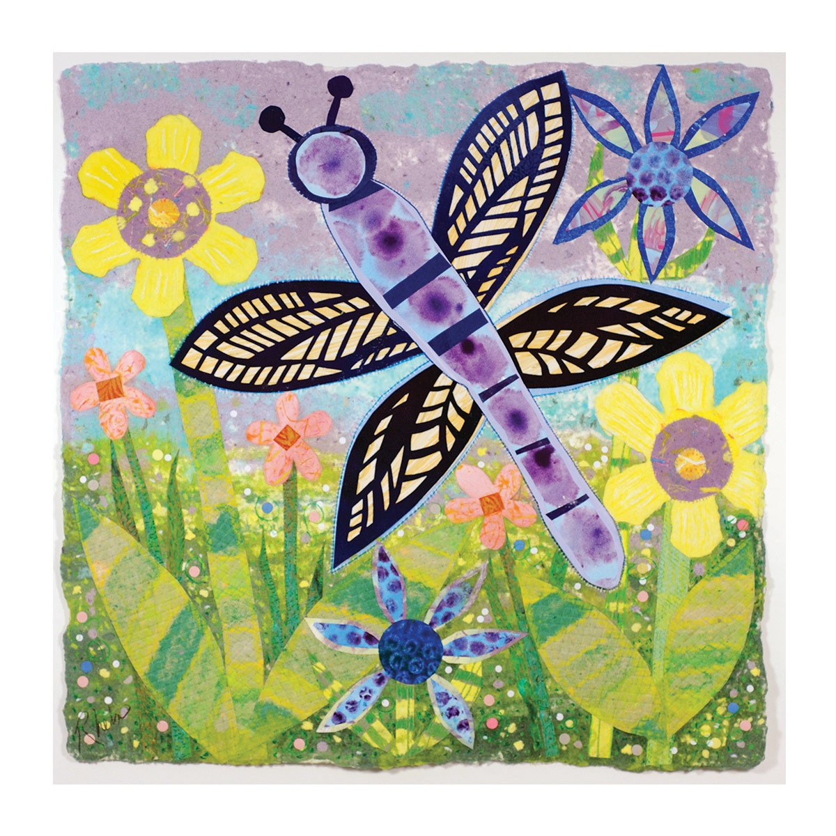 I feel honored to be a part of this program and to have the opportunity to create these colorful, whimsical gardens of hope and healing for the hospital setting. Many months were spent working with the committee at Children’s to come up with the final art. From initial concepts to scale drawings, (10 pieces are 20” x 28” and 1 piece is 24” x 24”) finding fabrics, making various handmade textured papers in the Children’s Hospital color palette , cutting out all the shapes and then creating a pulp painted base took a number of months. After the assembly of the elements in the wet stage, pressing and drying of the paper, I finally was able to look at the art hanging on a wall and did the finishing colored pencil drawing to enhance the details.