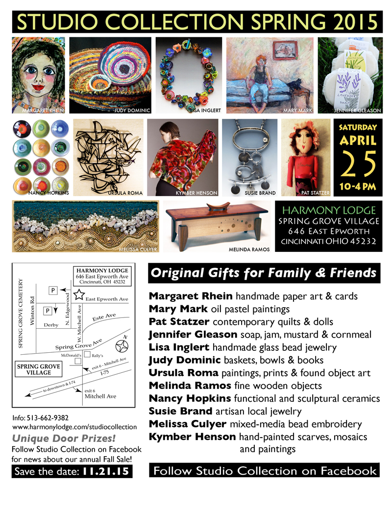 Looking forward to our FIRST  Studio Collection Spring Show. After 20 years our fall show has grown so popular that we wanted to give our collectors another opportunity to buy our eclectic art and crafts. We have invited 5 new guests artists to join our core group- all  creative women artists working in a variety of media.   Hope to see you there –  Saturday, April 25, 2015- 10am – 4pm at Harmony Lodge in Cincinnati, OH